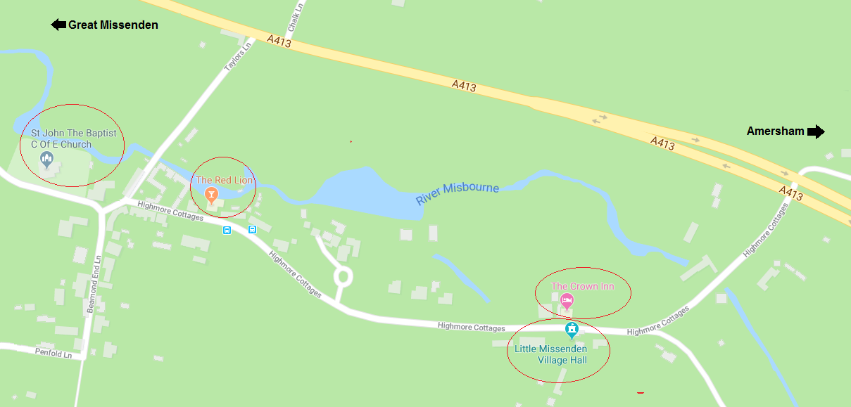 Little Missenden lies on a loop off the A413 between Amersham (3 miles) and Great Missenden (2 miles).